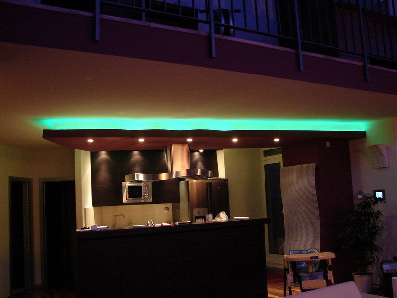 Osvetlitev kuhinje z visokosvetilnimi toplo belimi LED, ter RGB LED letvami. Različna stopnja zatemnjenosti in barve je vidna na prejšnji in na naslednjih slikah.